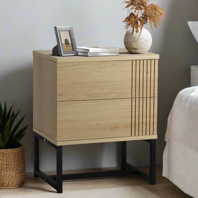 The Belgrado Modern Wood and Metal Bedside Tables | Natural Wood and Metal Storage Cabinet Tables are an essential part of any stylish bedside setup. Made with contemporary vibes, these tables are a perfect match for modern and eclectic home décor. With a flawless wood grain finish, attention to detail is evident in every aspect of this furniture piece. The distinctive striped accents on the drawer doors add character and focus to the design. The spacious drawers and top surface allow for ample storage and display space, while the smooth touch and sturdy construction ensure durability for years to come. The black powder-coated steel base adds stability and enhances the unique profile. Maintenance is simple with just a quick wipe, ensuring this attractive piece remains in pristine condition. Whether in the bedroom or any other room, the Oikiture Bedside Table is a must-have for a touch of modern elegance with timeless appeal.
