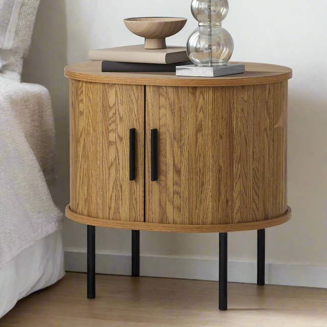 Eamus Retro Woodgrain Bedside Table | Sliding Door Modern Retro Look Bedside Storage Cabinet