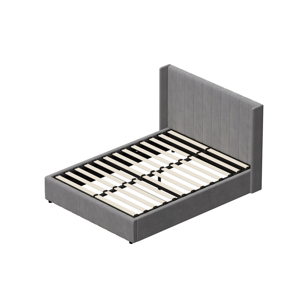The Allure Gas-Lift Bed Frame boasts a modern design with tall headboard, side winglets, and striped accents for a sleek and luxurious addition to any bedroom. Its premium velvet upholstery adds a plush touch, perfect for a peaceful night's sleep. The bedhead also offers comfortable support for sitting up in bed while reading or watching TV. Crafted with high-quality materials and precise workmanship, this bed frame features smooth edges for safe and comfortable use. Its sturdy legs and 13mm solid wood reinforced slats provide exceptional support for your mattress. In addition, the gas-lift hinges allow for easy access to underbed storage, making it a practical and space-saving furniture piece for any bedroom.