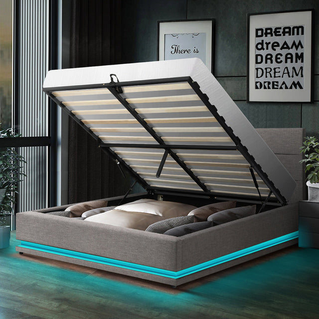Aria Supreme Luxe Grey Fabric LED Bed Frame | Modern Soft Touch Fabric Gas Lift Storage Bed
