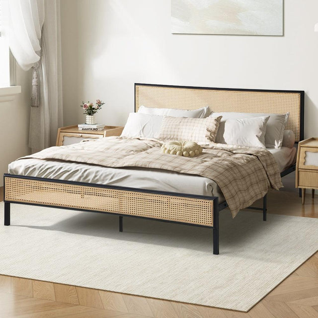 Aspen Retro Modern Rattan and Metal Bed Frame | Strong Metal Frame Bed with Rattan Headboard