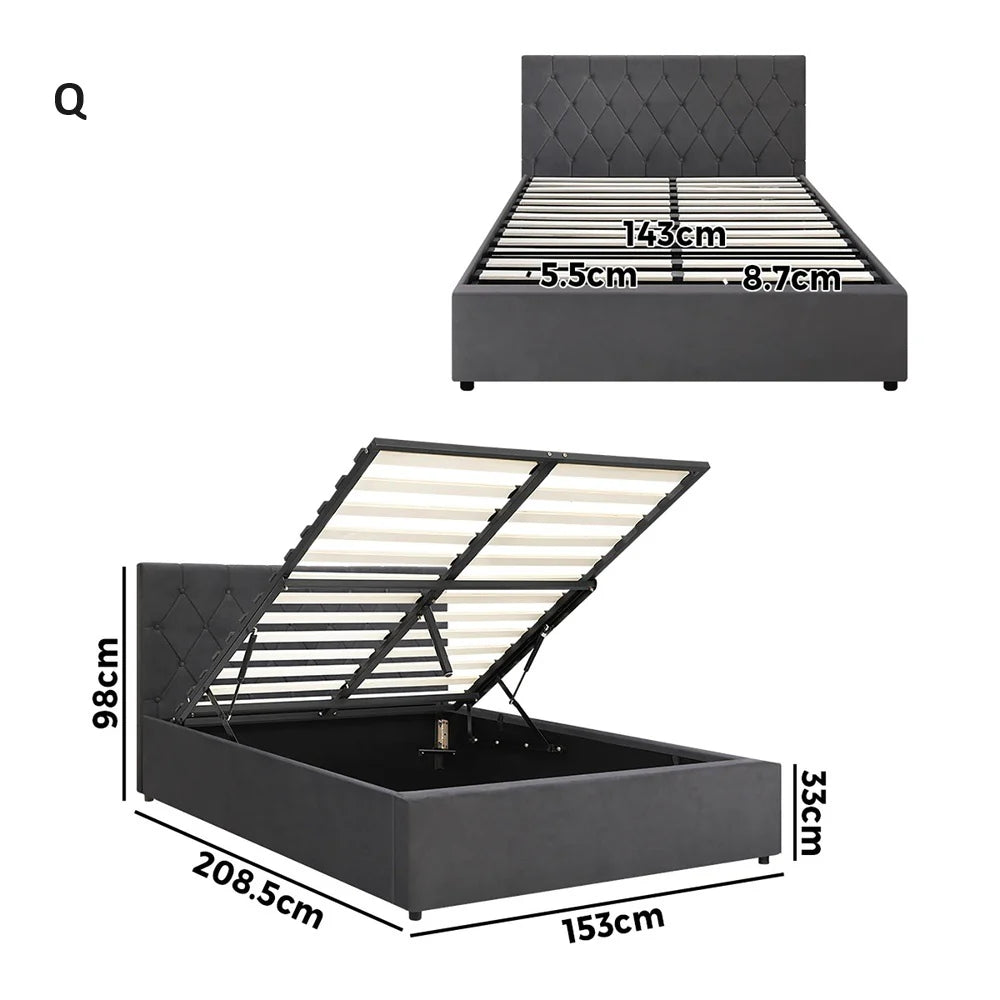 Upgrade your space with the Milano Gas Lift Bed Frame - a modern and timeless addition that adds a touch of sophistication to any room. Crafted with premium velvet fabric and meticulous attention to detail, it exudes a designer look. Featuring a discreet storage compartment that can be easily accessed through a gas lift mechanism, this frame provides ample space to store infrequently used items. Made with sturdy wooden slats and a solid base, it offers optimal support for a restful night's sleep. Indulge in the ultimate sleep experience with the Milano Gas Lift Bed Frame today.