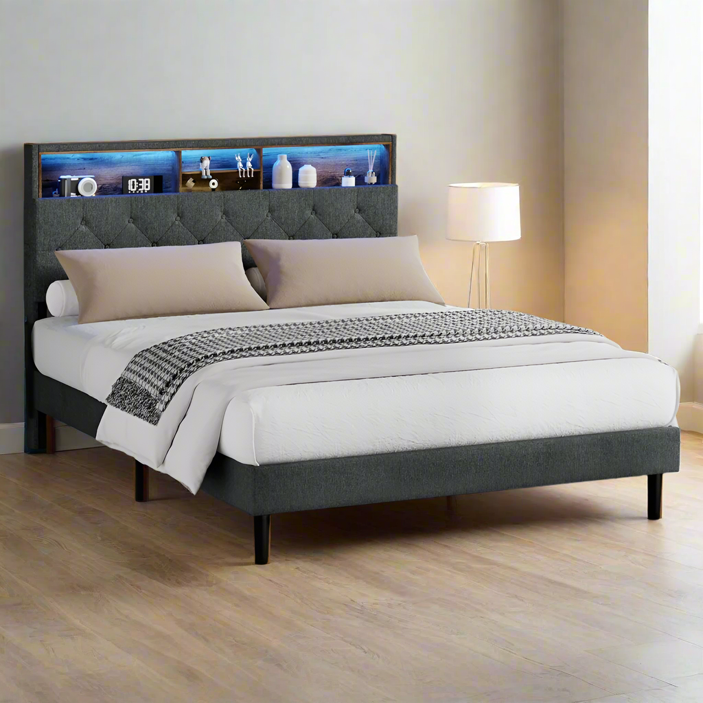 Discover the exceptional features and impressive design of the Piazzi LED Bed Frame. This luxurious bed frame boasts a comfortable tufted and padded bed head upholstered in premium fabric, creating a chic and classy look. But it doesn't stop there. Hidden behind the bed head is a convenient storage space, perfect for keeping items out of view yet easily accessible. Plus, a multi-tier display shelf above the bed head provides ample storage for all your bedroom essentials, with side pockets for added convenience. What sets this bed frame apart is the 16-colour LED light strip lining the display shelf, creating a beautiful ambient glow for all your bedside activities. And for even more excitement, activate the four flashing modes for a bedside light show. With meticulous finishing and sturdy construction, this bed frame is built to last and elevate your slumber time in style.Â