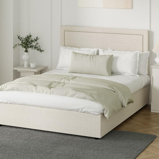 Scandi Luxe Linen Fabric Stud Trim Gas Lift Storage Bed | Premium Upholstered Storage Combo Bed Frame