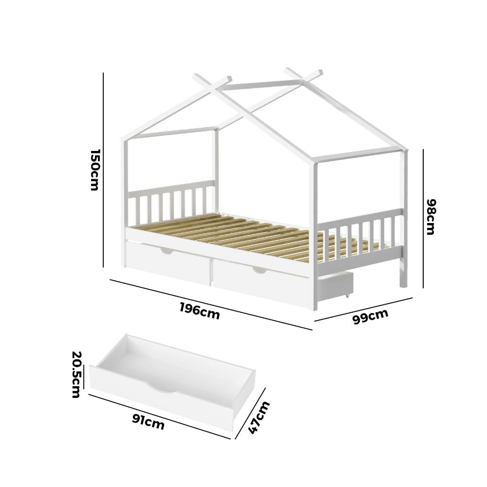 Transform your child's bedroom into a haven of creativity with the Scandi Luxe Premium Kids Timber House Bed. This funzee kids house style bed frame in single size is designed to spark imagination and provide a cozy home atmosphere for endless role-playing possibilities. String up decorations, add a fabric 'roof', or decorate with stickers to make this bed frame uniquely yours. Expertly constructed with natural solid pine wood and reinforced for durability, this bed frame features smooth edges and meticulous SGS-approved paintwork for safety and peace of mind. Plus, its low height allows for easy entry and exit, minimizing risks and accidents. This bed frame is designed to fit an Australian-size single mattress with minimal hassle, whether using your child's current favorite or purchasing a new one separately. With the Scandi Luxe Premium Kids Timber House Bed, your child will have sweet and exciting dreams in their own fantasy world. The two drawers storage is a perfect addition to this stunning kids bed.