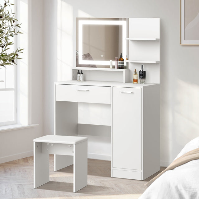Amoure Hollywood Dressing Table and Stool Set | LED Strip Mirror Storage Makeup Desk Cabinet