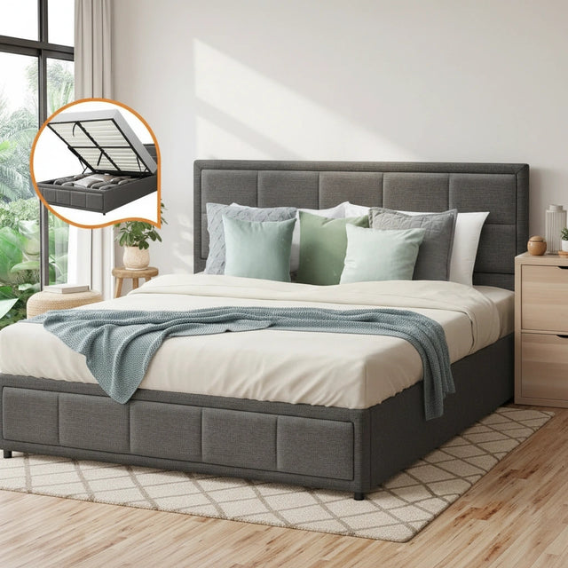 Experience luxurious elegance with the Nuvelo Padded Grey Fabric Deluxe Gas Lift Storage Bed Frame. The sophisticated 10-square embossed bedhead design and chic white upholstery exude bespoke style and offer a cozy, intimate atmosphere for a peaceful night's sleep. Meticulous craftsmanship and sturdy wooden slats ensure reliable mattress support, while the rubber wood legs ensure durability. With the assistance of hydraulic gas lift hinges, the bed frame can easily reveal ample storage space for bedding and other bedroom essentials. Assembly is hassle-free and can be completed in under 30 minutes. Available in King Single, Double, Queen, and King sizes, this bed frame is compatible with most Australian-sized mattresses.
