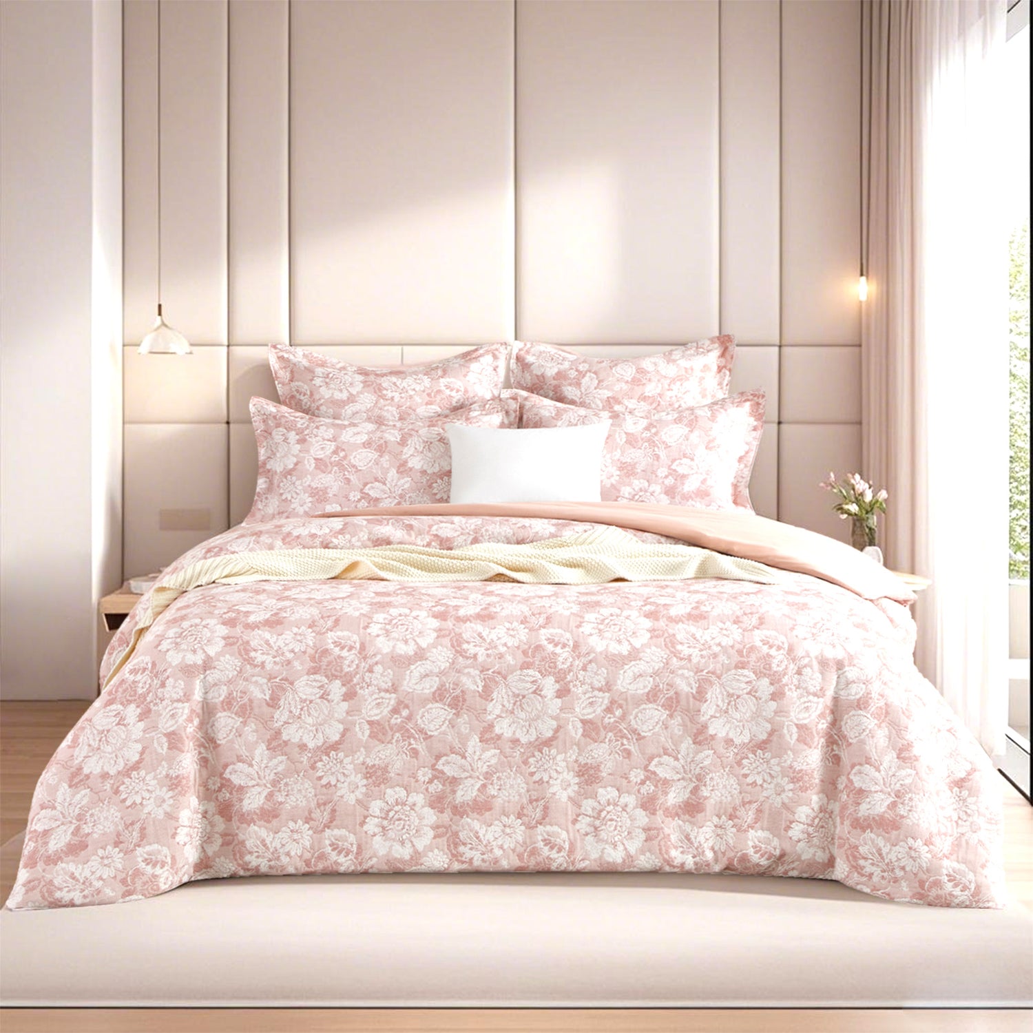 The Roselia quilt cover set features an intricately woven floral jacquard pattern crafted from a cotton blend, presented in a gentle blush shade. This jacquard texture enhances your bedroom with refined elegance while promoting breathability and comfort throughout the year. Its romantic floral motif adds sophistication and charm, serving as an elegant focal point in any bedroom. The soothing, natural hue pairs seamlessly with various colour schemes, simplifying décor coordination. Combining quality, comfort, and timeless style, the set includes a quilt cover and matching pillowcases.