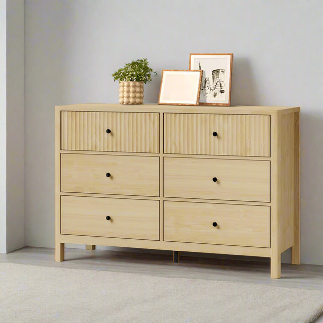 Upgrade your current chest of drawers with this striking piece. Our chest of drawers has a contemporary design and features a natural wood-like finish and unique raised stripe textures on the top two drawer fronts. This thoughtful design adds a touch of individuality to any space. The six drawers provide ample storage space and the zinc alloy handles make opening and closing effortless, even when fully loaded. Smooth metal runners make using this chest of drawers a breeze, while the top surface offers additional display space and versatility for placement in any room of your home. Made with a mix of particle board, MDF, and melamine materials, this chest of drawers is durable and has sturdy, curved legs at a practical height for easy cleaning. The attention to detail and fine workmanship is evident from top to bottom, and maintenance is simple with just a quick wipe. Assembly is easy with our straightforward instructions.