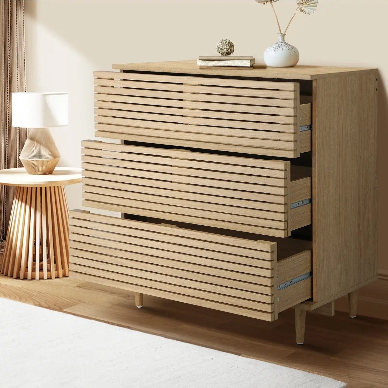 Need to save space for bedroom necessities or household items? Look no further than the Centrum Bedroom 3 or 6 Chest of Drawers Tallboy Cabinet. This modern tallboy storage dresser cabinet is both practical and long-lasting thanks to its carefully sourced materials and meticulous craftsmanship. With an emphasis on quality and adherence to stringent standards, this chest of drawers is built to maintain timeless form and function. The slatted facade sets this Oikiture Chest of Drawers apart as a unique and efficient addition to your decor.