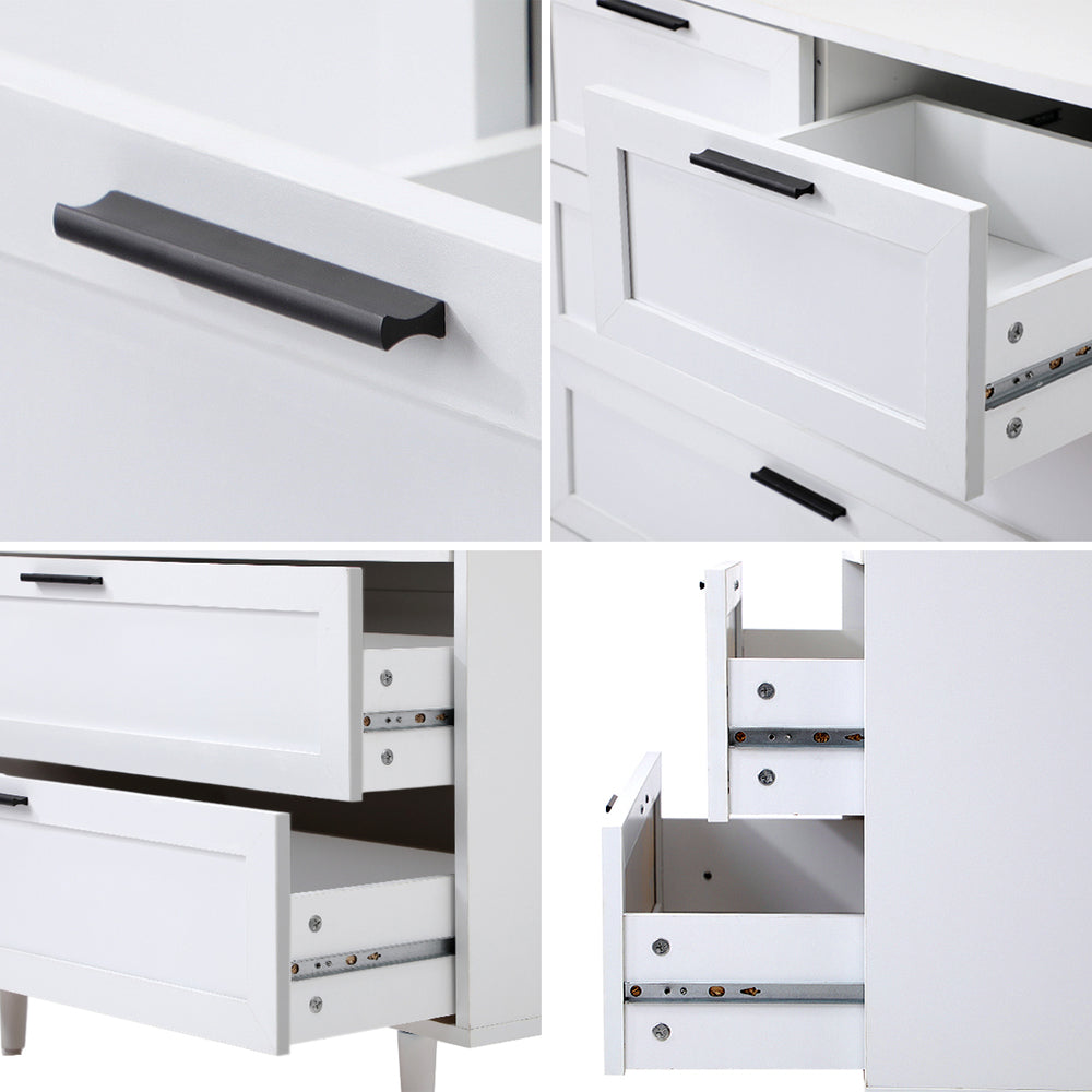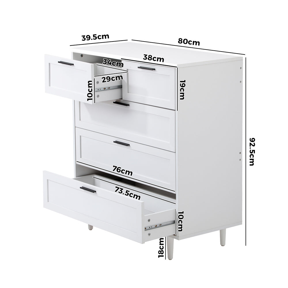 As an expert in the industry, Oikiture presents the Essenza Mila 5 Draw Modern Dresser Tallboy that exudes sophistication and practicality. With an immaculate white finish and sculpted front drawer panels, this chest of drawers adds depth and character to any home. The five drawers, including two small and three large drawers, offer ample storage space with the assistance of contrasting black aluminium alloy handles and smooth metal runners. The top of the chest of drawers also provides additional display space, making it a versatile piece for any room in your home. Crafted from 15mm particle board and sturdy solid wood legs, this dresser is both durable and easy to clean. Its fine workmanship and attention to detail are evident, and assembly is a breeze with the included instructions. Keep it in pristine condition with a simple wipe down.