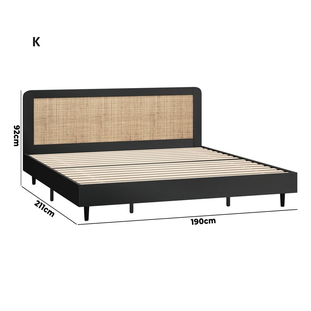 Transform your bedroom into a tranquil haven with the Abruzzi bed frame in black and rattan. This stunning piece boasts a rattan headboard, combining contemporary design with a rustic touch for a timeless look. Crafted from high-quality rattan for lasting durability, this bed frame invites you to relax and enjoy its plush comfort. Its intricately woven headboard provides back support, offering a luxurious resting spot. The rattan's gentle curves and organic patterns create a warm atmosphere, perfect for winding down. Easy assembly ensures a stress-free set-up, allowing you to indulge in its luxury. Upgrade your sleeping space and experience a realm of beauty and comfort with the Oikiture bed frame.