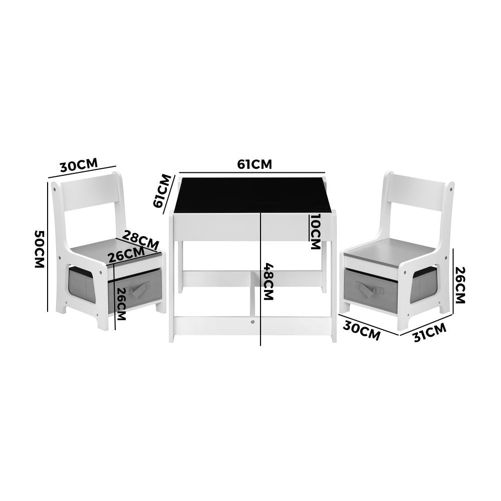 Oikiture 3-in-1 (Kids Table Chair Set) is a must-have for kids aged 3+. The thoughtfully-designed tabletop has two sides, one flat surface for dining and reading and the other chalkboard surface for drawing and playing. Beneath the easy-turn-over tabletop, there hide large storage compartments, ideal for kids to stow away their blocks, storybooks, chalk, crayons and other things. With sleek and stylish design, it's fit for living room, playroom, or kids' bedroom. This table and chair set is made from eco-friendly and non-toxic sturdy MDF board that offers solid support and long-lasting durability. It is also easy to assemble and clean. Oikiture, the perfect gift for your kids!