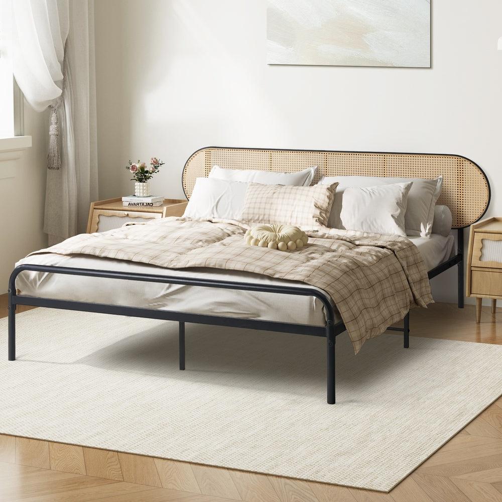 Mona Retro Modern Arched Rattan and Metal Bed Frame | Strong Metal Frame Bed with Rattan Headboard