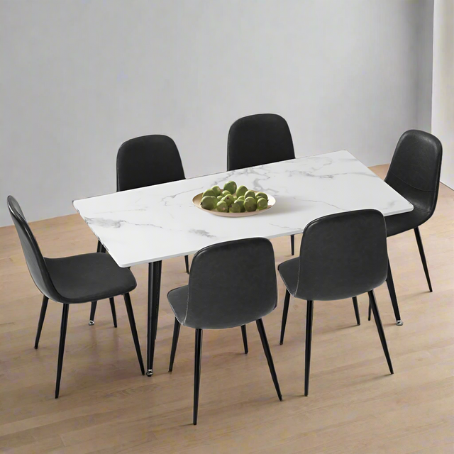 Experience the epitome of contemporary elegance with our Murano 5-7 seater Marble Style Dining Table Set. The sleek design of the modern table serves as the ideal backdrop for a refined and comfortable dining experience. Partnered with our lavish Grey Slim Profile Chairs, this set transforms into a striking centerpiece that demands admiration. Indulge in the luxurious comfort of the chairs, featuring sumptuous PU leather fabric that adds a touch of opulence and tempts you to fully enjoy every meal. Crafted with a blend of style and comfort in mind, these chairs are a visually pleasing addition to your dining space, appealing to both the eye and the senses. Explore the cohesive aesthetics of this set, as the synergy between the dining table and chairs creates a curated and sophisticated look for your home. Carefully chosen materials and finishes ensure that each component complements the others, elevating the overall allure of your interior. Constructed with meticulous attention to detail, this set boasts a sturdy build and long-lasting