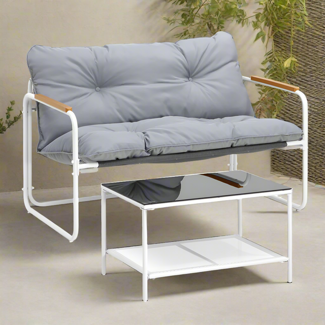 Maximize the enjoyment of your outdoor living experience with the Sierra Outdoor Patio 2-pc Lounge Set. Whether lounging under the sun, moon and stars or sharing tete-a-tete conversations, this stylish and contemporary set has all the makings of luxurious outdoor furniture. The well-padded cushioned seats and smooth composite wood/plastic armrests offer ultimate comfort, while the matching coffee table and additional shelf provide ample space for drinks and snacks. This weather-resistant set is perfect for the harsh Australian climate, with a powder-coated metal seat frame for added strength and durability. Plus, the chic design also complements any indoor décor for a versatile addition to your home. Ready to elevate your outdoor relaxation game? Look no further than the Sierra Outdoor Patio 2-pc Lounge Set.
