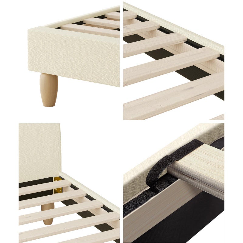 Transform your bedroom into a serene oasis with our bed frame. Equipped with sturdy legs and slats featuring Velcro attachments, this bed offers added stability for a peaceful night's sleep. The bedhead and frame showcase a unique fabric finish and are crafted from high-quality materials that provide a plush touch. Experience ultimate comfort while reclining against the cushioned headboard and indulging in a good book or watching TV in bed. Expertly designed and crafted with high-quality materials, this bed frame provides both style and comfort for a peaceful night's sleep. Sturdy legs and slats with Velcro attachments offer added stability, while the unique fabric finish adds a touch of elegance to your bedroom. Whether you're enjoying a good book or catching up on your favorite TV show, this bed is the perfect retreat for relaxation and rejuvenation.