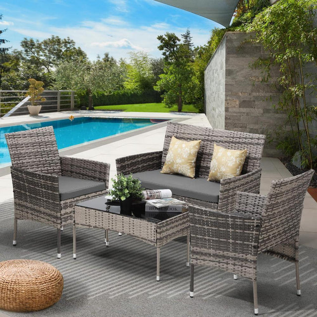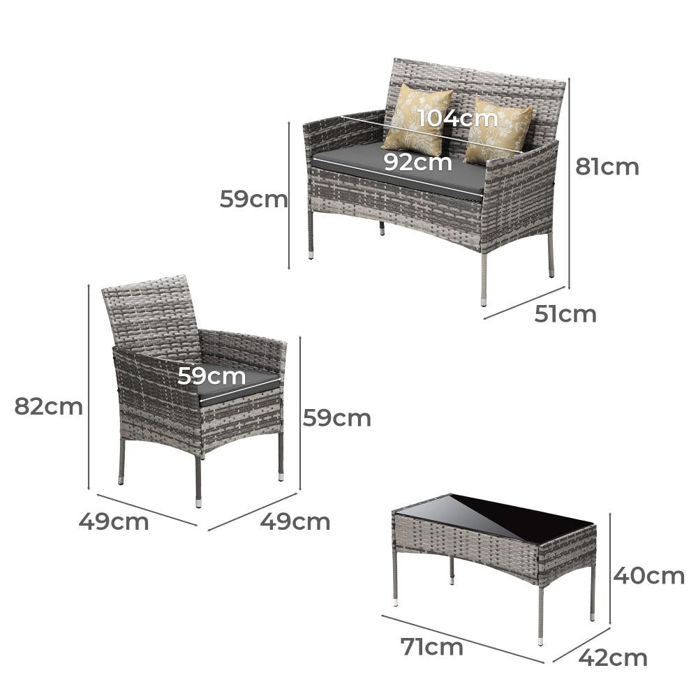 Introducing the Terraza Premium Wicker Rattan 4pc Outdoor Furniture Set: the ideal way to elevate your outdoor living space. Boasting a perfect blend of sleek style and durable construction, each piece is crafted from premium materials to withstand the elements, so your investment stays beautiful and functional for years to come. The single armchairs feature supportive backrests and comfy cushions, providing hours of relaxation after a long day. The 2-seater lounge, perfect for couples or close friends, is the ideal place to share cozy conversations together. Lastly, the stylish coffee table is designed to handle refreshments while exuding sophistication. From romantic evenings to summer gatherings, our Patio Set delivers comfort and style in any setting. Transform your patio into a true retreat and enjoy the outdoors like never before!