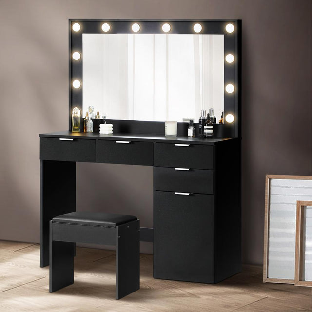 Venezza Large LED Mirror Dressing Table and Stool Set | 10 Light Hollywood Light | Makeup Desk Storage Drawer - Black is backordered and will ship as soon as it is back in stock.