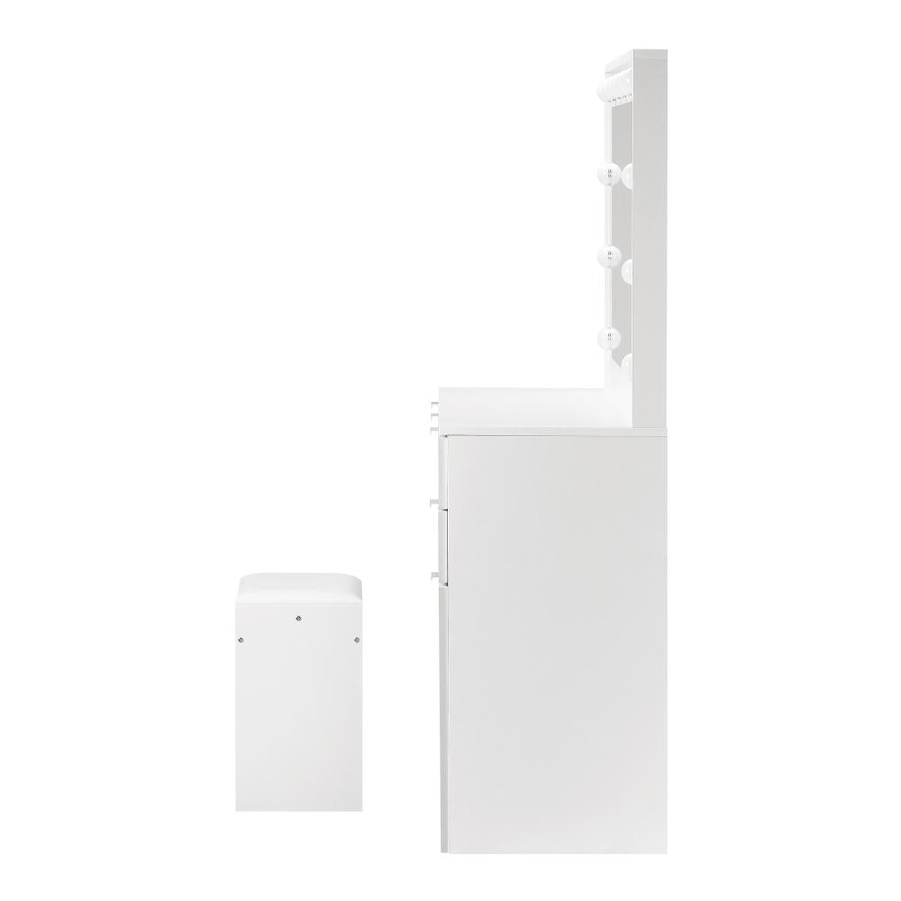 Transform your bedroom with the luxurious Oikiture Dressing Table and Stool Set. Perfect for sprucing up your makeup area, the set features a high-definition glass mirror that creates stunning clarity and provides 12 LED lights with three colour options and adjustable 10-level brightness. It's like having your own personal makeup and photo studio. Crafted with durable E1 particle board, the table is complete with a table top, USB input, four deep-set drawers and two adjustable closed shelves. The matching stool is padded with high-resilient sponge and upholstered with PU leather for added comfort. Bring a touch of elegance and enjoy your own beauty haven with a stylish Oikiture Dressing Table and Stool Set.